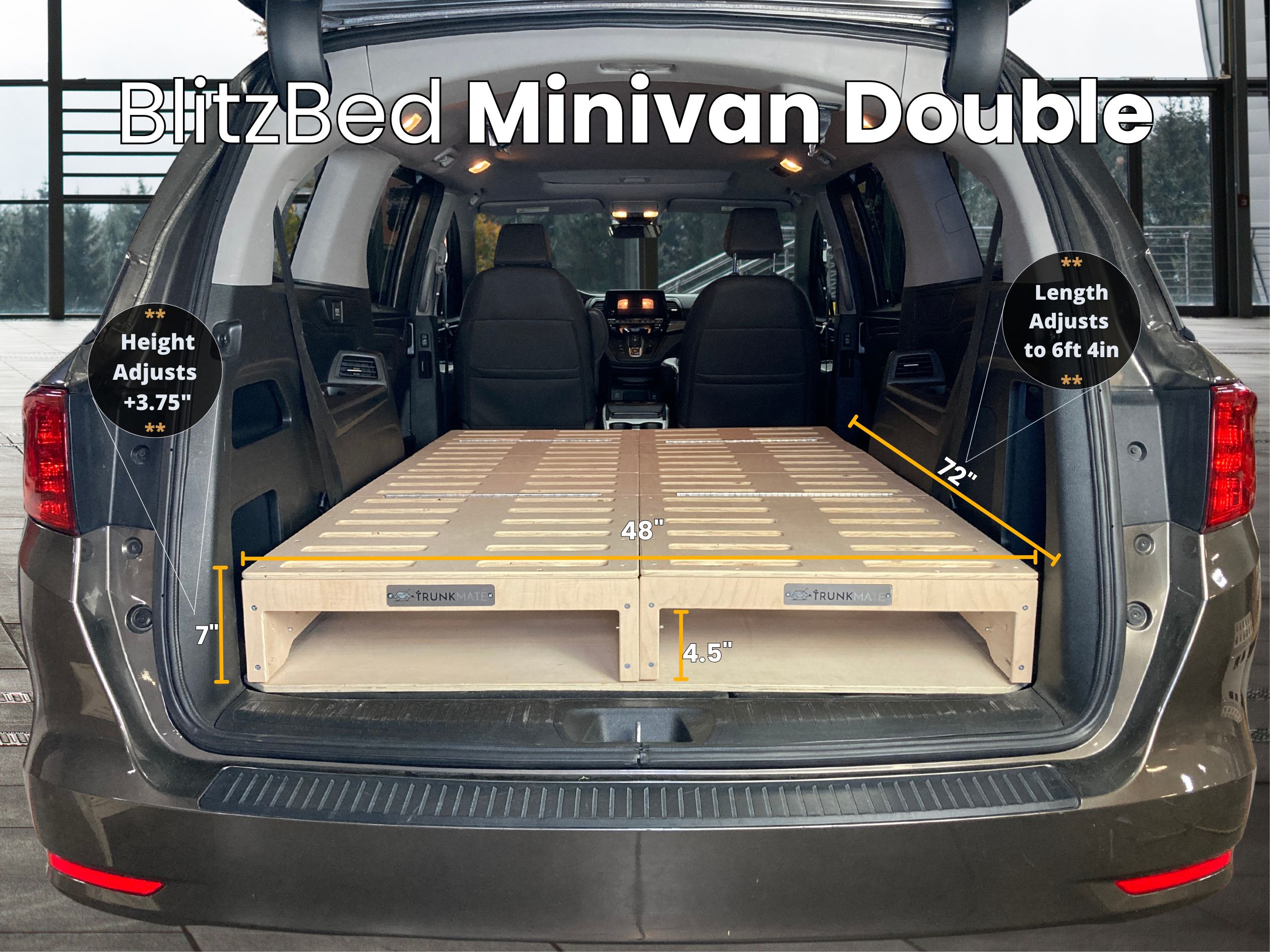 The BlitzBed has incremental adjustability that allows it to fit inside any minivan.
