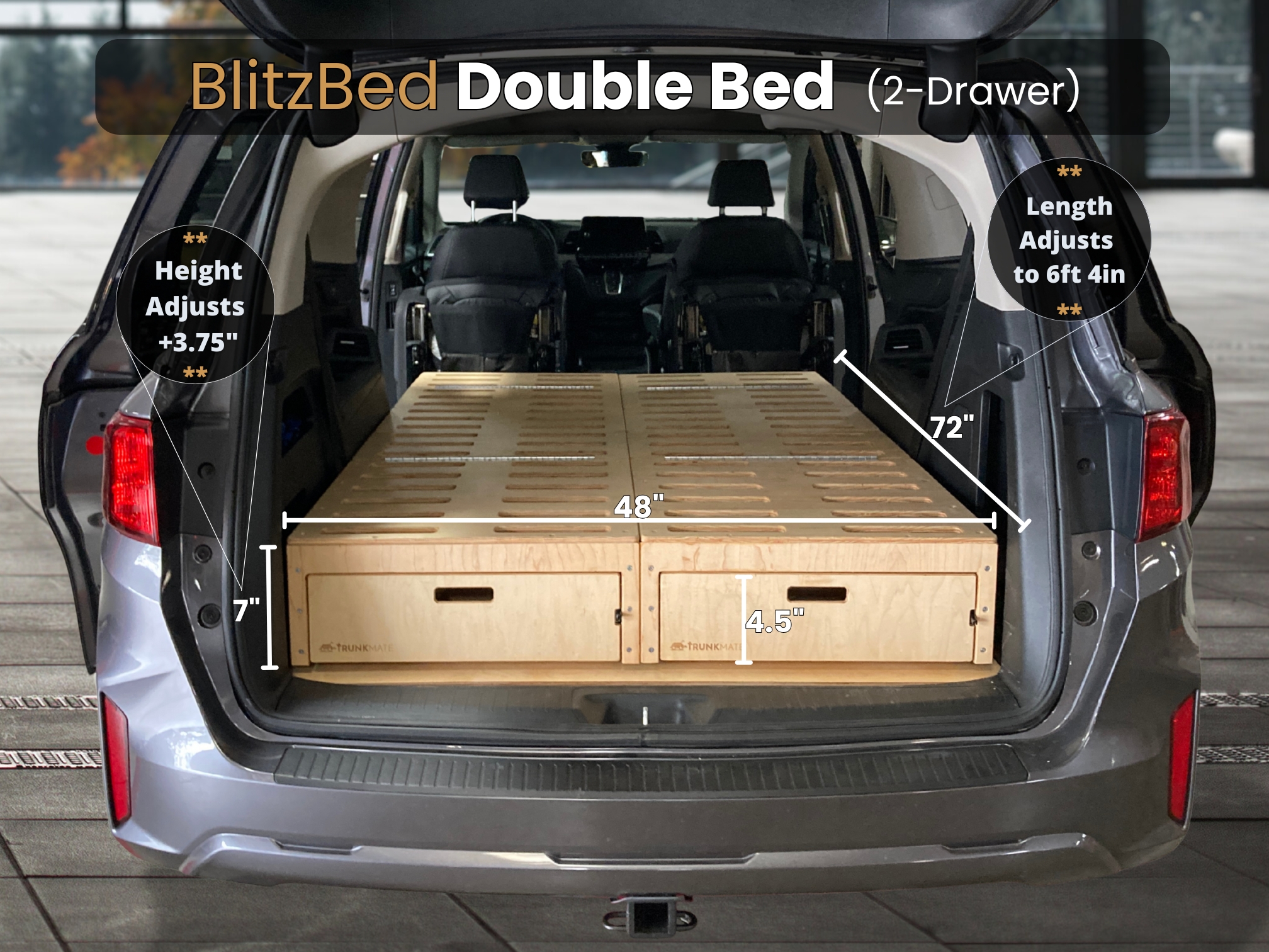 The BlitzBed Sleeping Platform for Minivans – Double 50/50/2-Drawer/Armor Black